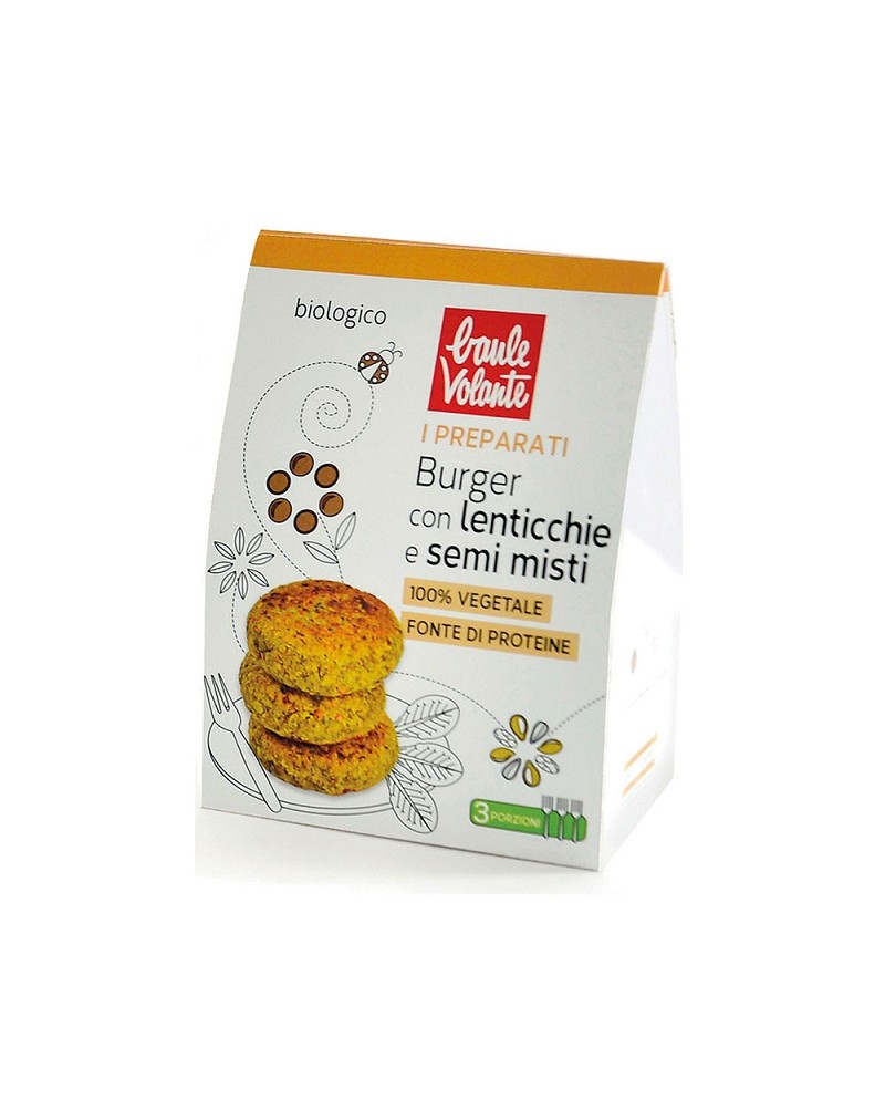 Preparato per burger di lenticchie e semi misti "Baule volante" in confezione da 180g. Biologico, ideale per la preparazione di burger vegani, per un pasto veloce e sano.