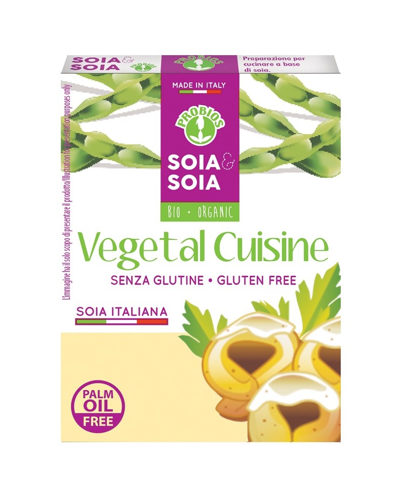 Crema vegetale a base di soia "Vegetal cuisine" in confezione da 200ml. Crema vegetale alternativa alla panna da cucina. Ottima per la preparazione di salse e per insaporire in cottura pasta, verdure, pesce. Adatta anche a crudo con frutta e dolci. Senza glutine.