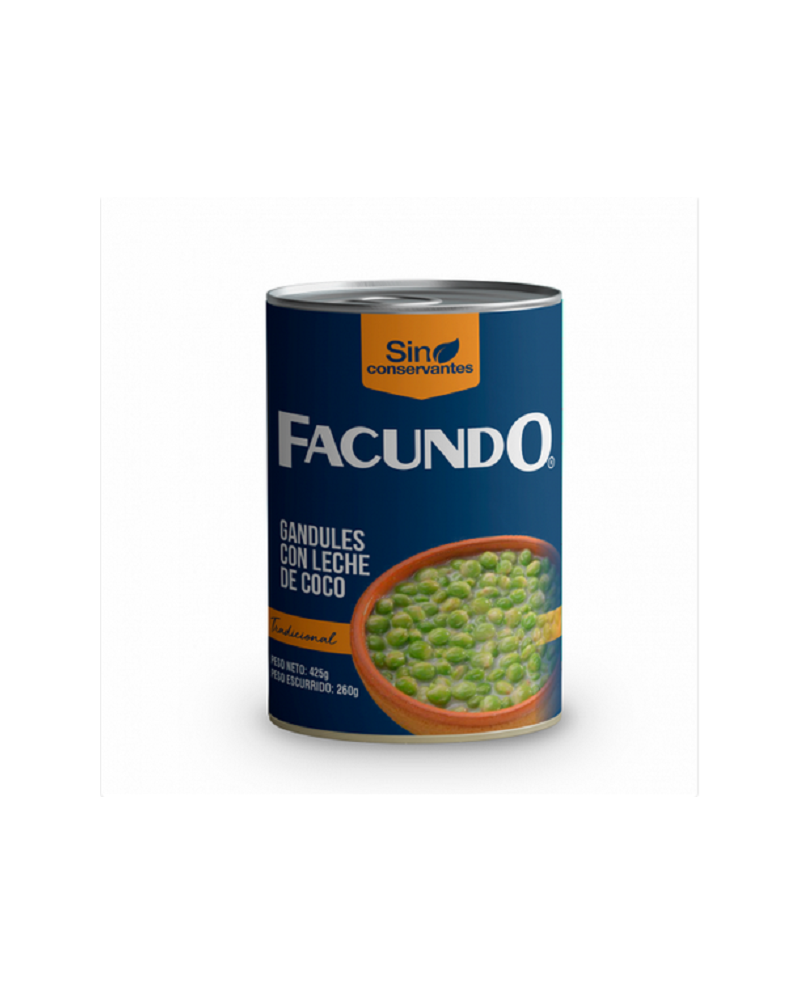 Gandules Facundo Piselli verdi con latte di cocco in scatola da 425g. Piselli freschi e saporiti immersi in un delizioso velo di latte di cocco. Un piatto gourmè!