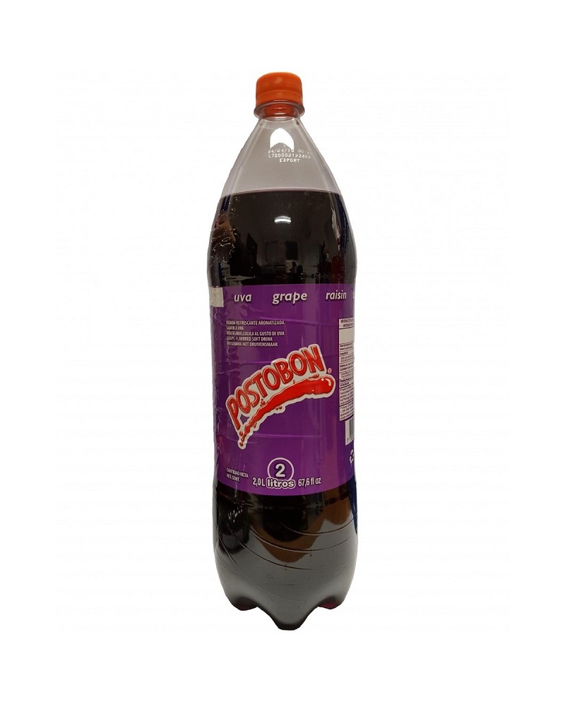 Gassosa uva Postobon in bottiglia da 2L. Bevanda analcolica frizzante all'uva. Prodotta da una delle aziende top sudamericane nella produzione di bibite commerciali.