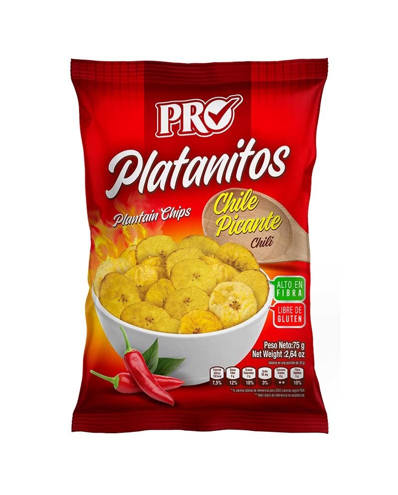 Platanitos chile picante PRO. Snack di platano fritti e piccanti in confezione da 70g. Chips croccanti realizzate con platano verde (la variante amidosa) fritto e condito con una miscela di spezie piccanti (principalmente peperoncino e paprika) e sale. Offrono un gusto salato e decisamente speziato. Sono uno snack popolare nel Centro America, ideale per chi cerca una patatina croccante con un kick piccante.