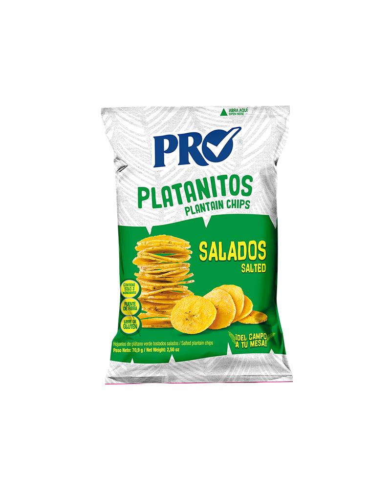 Platanitos PRO. Snack di platano fritti e salati in confezione da 70,9g. Chips croccanti ottenute dal platano verde (la variante amidosa della banana da cottura), affettato e fritto in olio vegetale. Sono condite semplicemente con sale, offrendo un sapore salato e neutro simile a quello delle classiche patatine fritte, ma con la consistenza e il gusto distintivo del platano. Sono uno snack base in Centro America e sono adatti ai vegani e naturalmente privi di glutine.