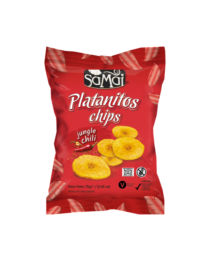 I Platanitos Chips Piccanti di Samai sono chips di platano verde (la variante non matura) croccanti e fritte. Sono condite con sale marino e una miscela di peperoncino in polvere per un tocco di piccantezza speziata. Offrono una combinazione di sapore salato, amidoso (proprio del platano verde) e piccante. Sono uno snack popolare dell'Ecuador, naturalmente senza glutine, senza aromi né coloranti artificiali aggiunti, e adatti ai vegani.