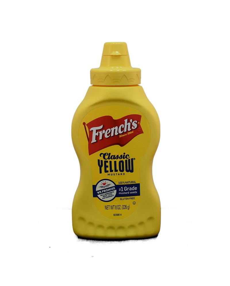 French yellow mustard senape da 226g. E' la senape americana più popolare, caratterizzata dal suo colore giallo brillante e dal sapore delicato ma leggermente pungente e acidulo. Realizzata con semi di senape macinati a pietra, non contiene grassi ed è l'accompagnamento essenziale per hot dog, hamburger e pretzel, incarnando il vero gusto del barbecue americano.
