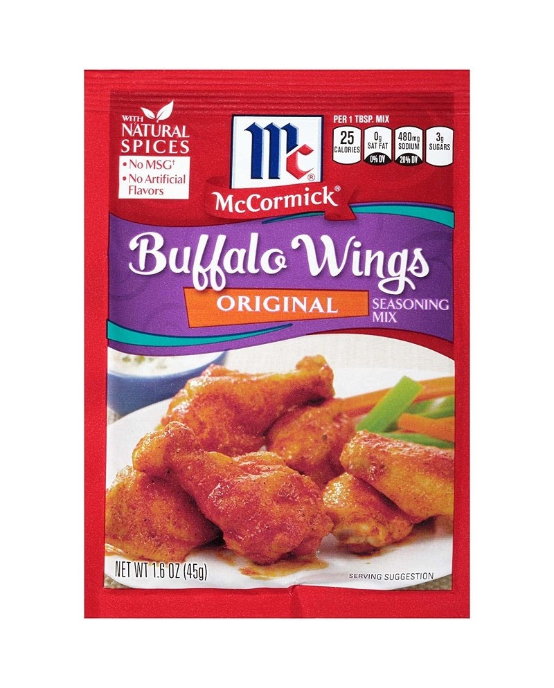 McCormick Original Buffalo Wings confezione da 45g. Miscela di condimenti piccanti, dolci e speziati; senza aromi artificiali. La miscela di spezie firmata McCormick mette a portata di mano i sapori indimenticabili di aglio, peperoncino e paprika per perfette ali di pollo.