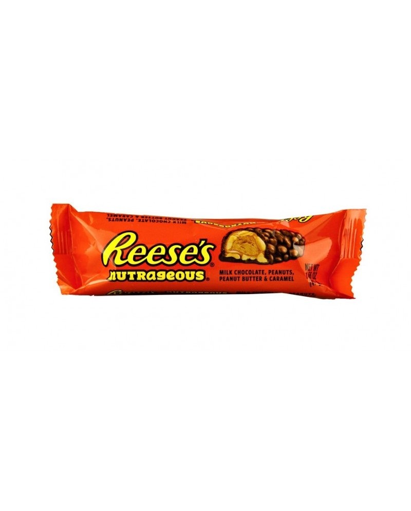 Reese's nutrageous da 47g. Variante "snickers" Reese's con un ripieno di caramello e burro d'arachidi, ricoperto da uno strato al cioccolato al latte e croccanti arachidi!