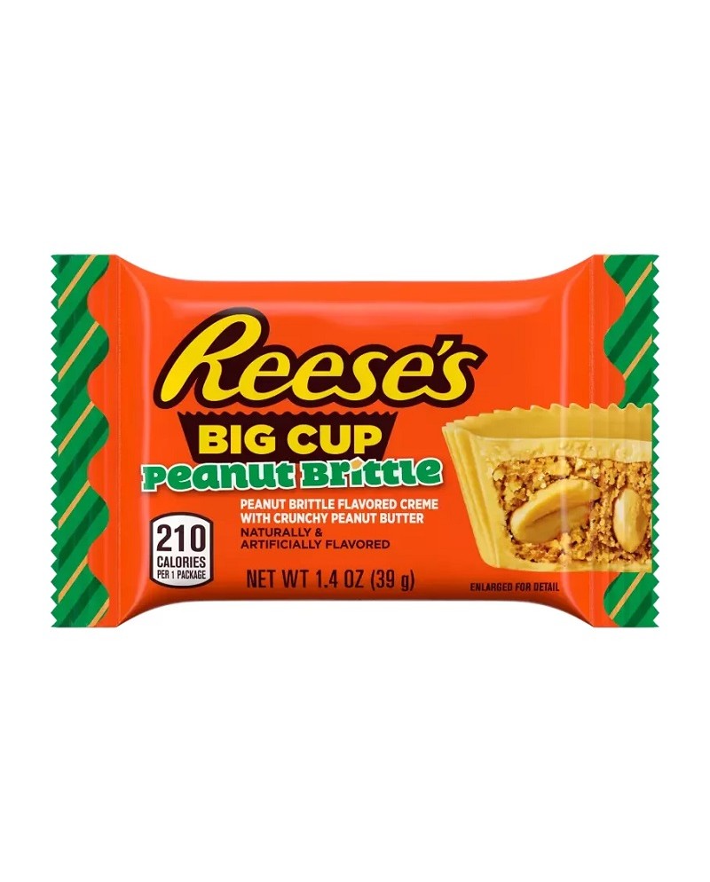 Reese's big cup peanut brittle da 39g. Snack "cup" in formato grande con copertura di cioccolato croccante aromatizzato alle arachidi ed un ripieno di burro di arachidi crunchy Reese's, con pezzetti di arachidi tostate! Un mix di sapori unico con note dolci e salate. Ordinalo da Cristaldi!