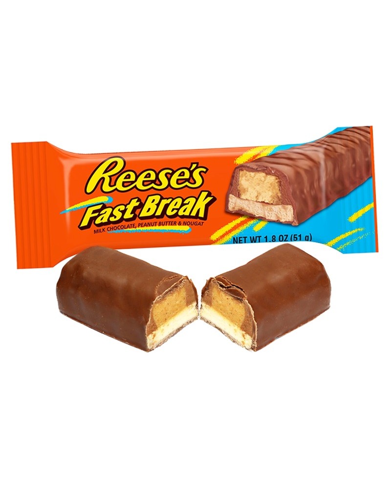 Reese's fast break barretta da 51g. Snack dolce avvolto da cioccolato a latte con due strati all'interno: uno al classico e intramontabile burro d'arachidi e l'altro al torrone!