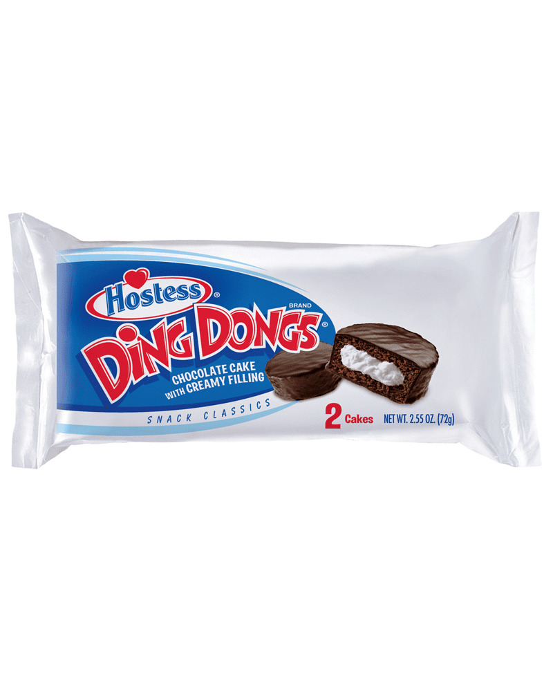 Hostess ding dongs tortine al cioccolato da 72g. Ricoperta di cioccolato fondente e ripiena di crema. Confezione da due merendine. Mettila nella tua borsa e avrai sempre lo spuntino perfetto a portata di mano.