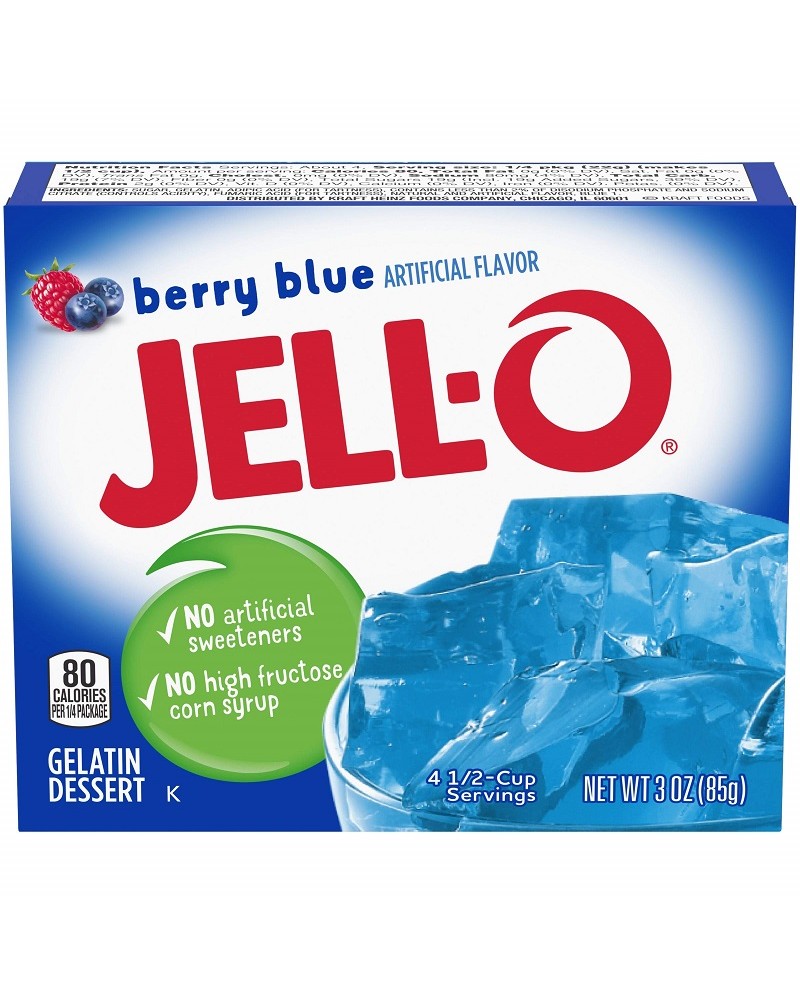 Jello berry blue da 85g. Preparato per una squisita gelatina senza aromi artificiali Jell-O ai frutti di bosco disponibile da Cristaldi con consegna rapida online.