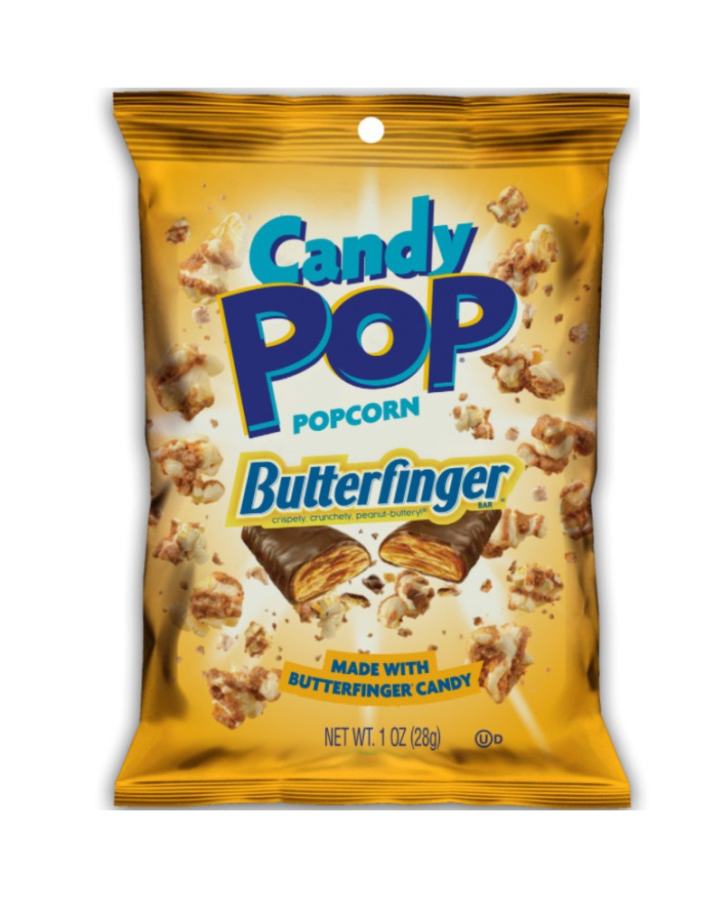 Candy pop corn butterfinger da 28g. I popcorn leggeri e croccanti al cioccolato e burro d'arachidi con l’aggiunta di pezzetti di Butterfinger, una delle più famose barrette americane.