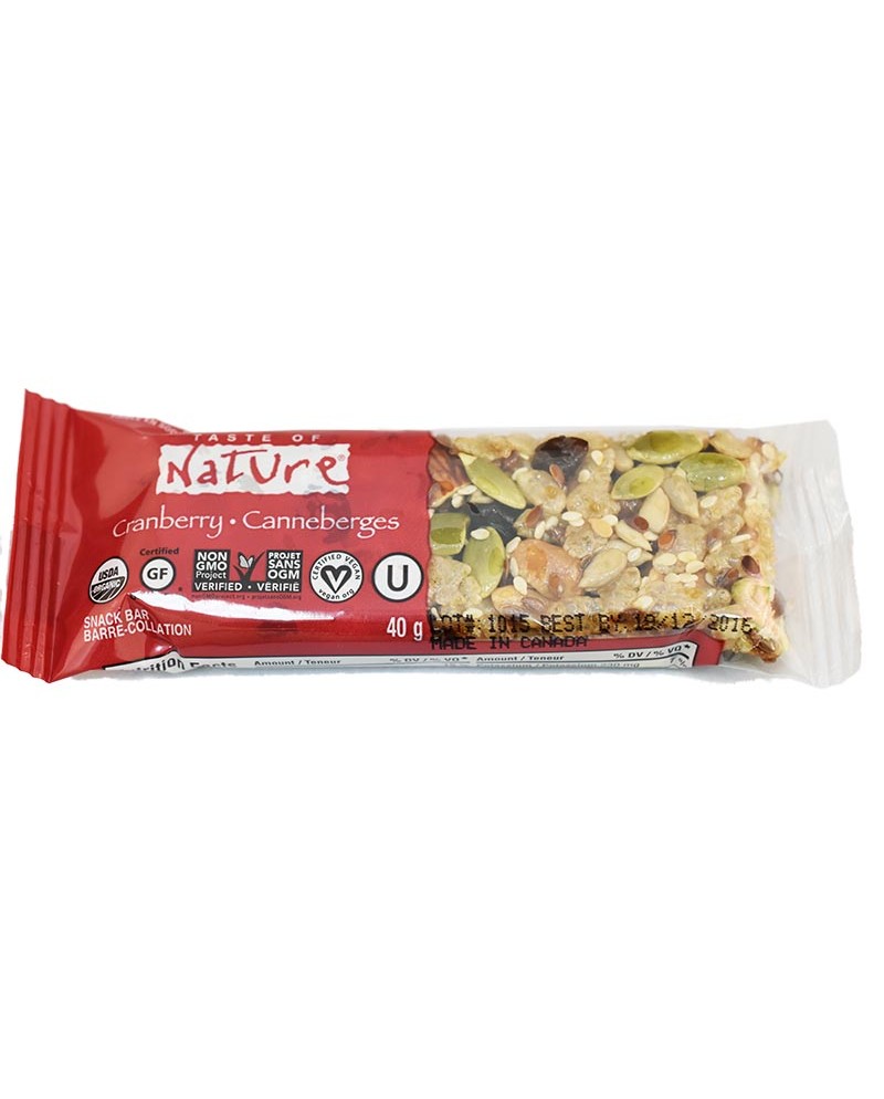 Barretta ai cranberries bio "Taste of nature" da 40g. Deliziosa barretta biologica con mirtilli rossi, semi, cereali e arachidi. Ideale per un break veloce e sano.