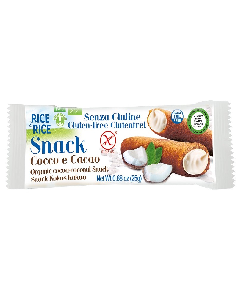 Snack di cocco e cacao Probios da 25g. Goloso cannolo al cacao ripieno di crema al cocco, senza glutine. Con cialda croccante a base di quinoa e miglio.