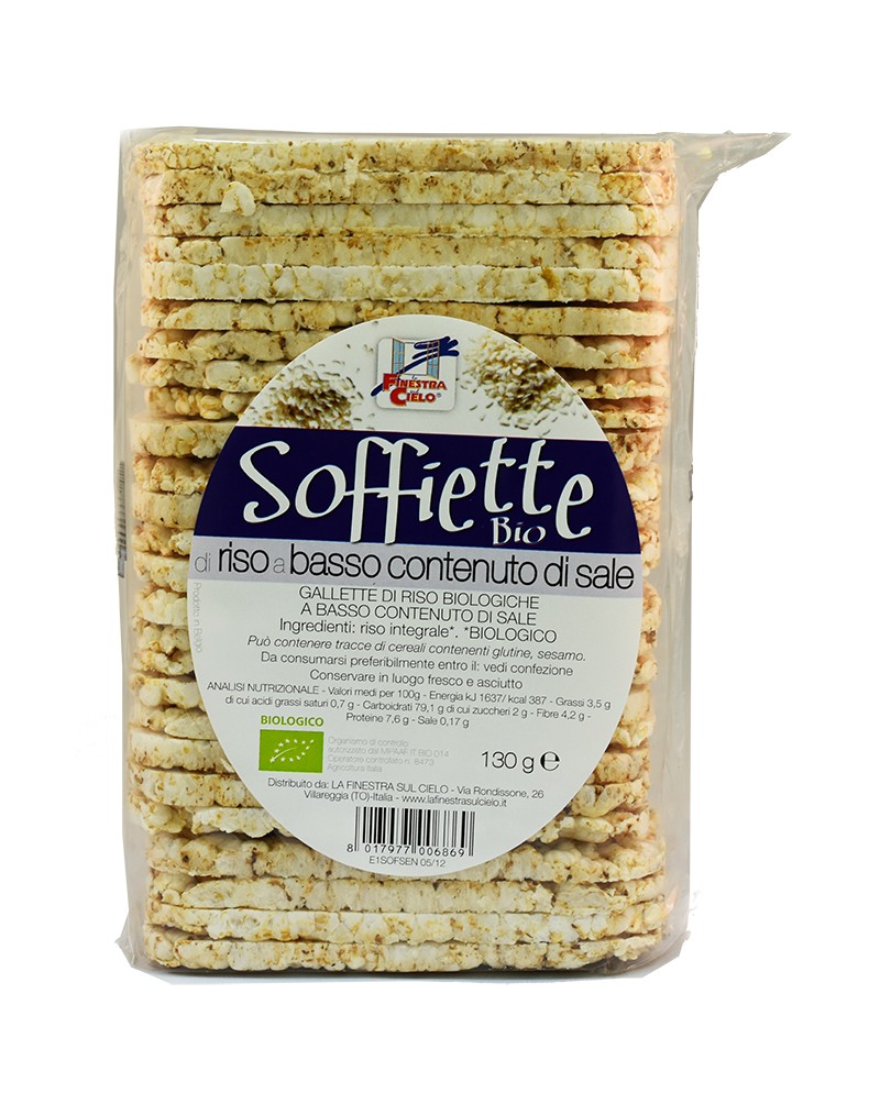 Soffiette di riso "La finestra sul cielo" in confezione da 130g. Più sottili delle normali gallette ma più croccanti e fragranti, realizzate con riso integrale.