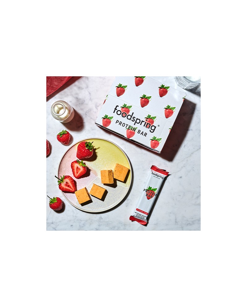 Barretta proteica Foodspring da 60g con pezzetti di fragola, yogurt in polvere e noci. Ideale come pasto sostitutivo o come integrazione post work-out. Con dolcificante.