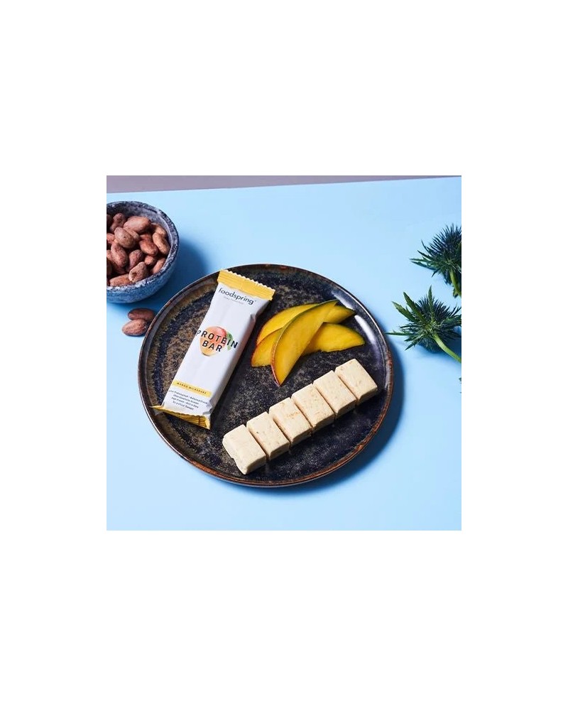 Barretta proteica Foodspring da 60g al gusto mango e milkshake. Con deliziosi fiocchi di mango. Ideale come integrazione post work-out.