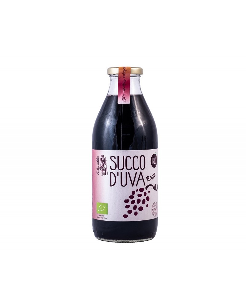 Succo d'uva rossa Folice in bottiglia di vetro da 750ml. Puro succo d'uva rossa da agricoltura biologica. Prodotto con uve mature raccolte a mano, spremuto e poi pastorizzato in bottiglia a "bagnomaria". Contiene solo zuccheri naturali.