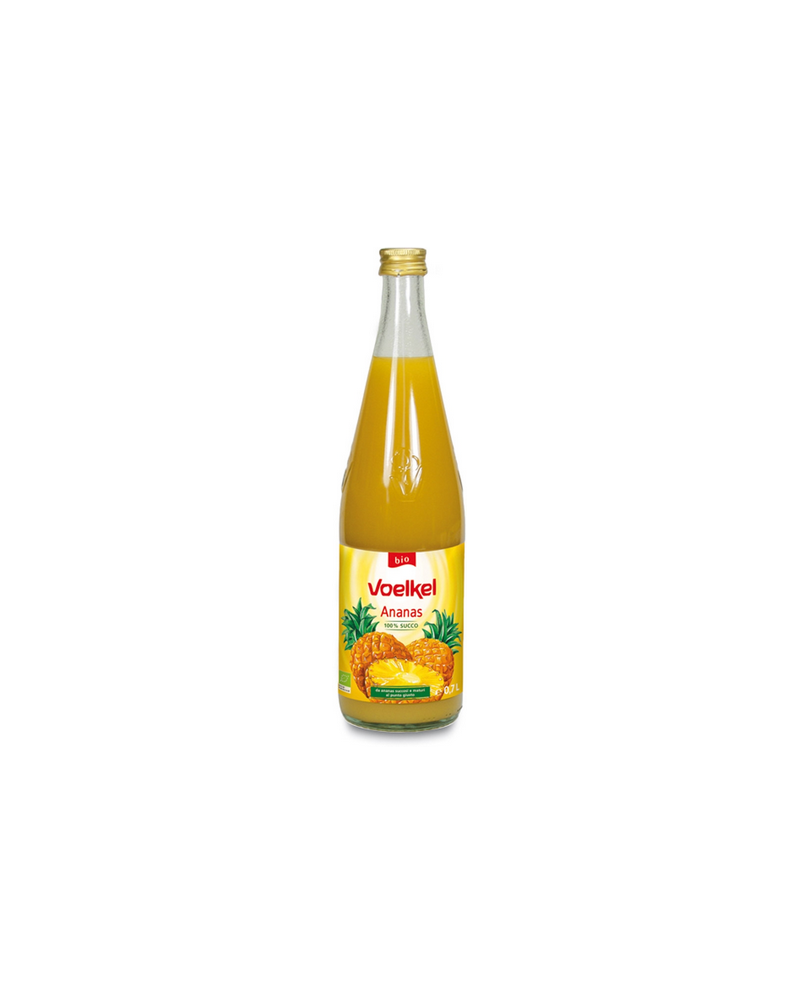 Succo di ananas Voelkel 100% naturale in bottiglia da 700ml. Prodotto con solo ananas mature. Ricco in sali minerali e vitamine. Ha proprietà anti infiammatorie e contribuisce a combattere cellulite e ritenzione idrica.