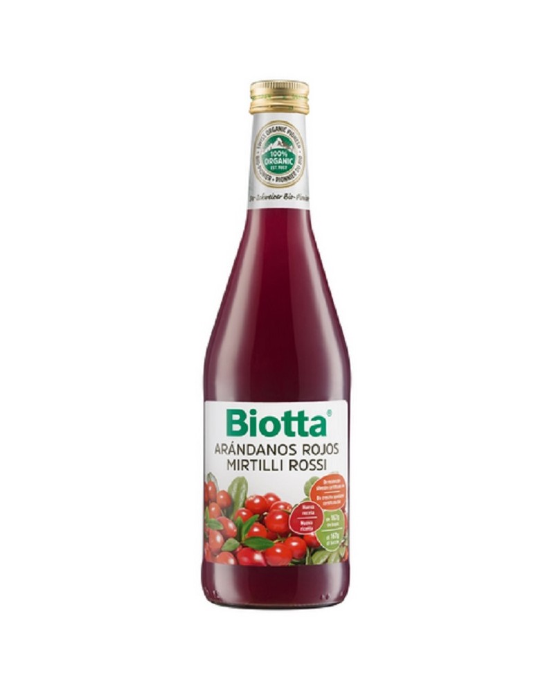 Succo di mirtilli rossi Biotta in bottiglia da 500ml. Infuso dal dolce succo di bacche di mirtilli rossi di montagna bio. Dall'alto valore nutritivo.