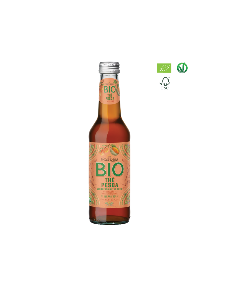 Te' pesca e melone bio Tomarchio in bottiglia da 275ml. Infuso di thè nero con melone e pesca siciliana aromatizzato naturalmente, per un gusto autentico.