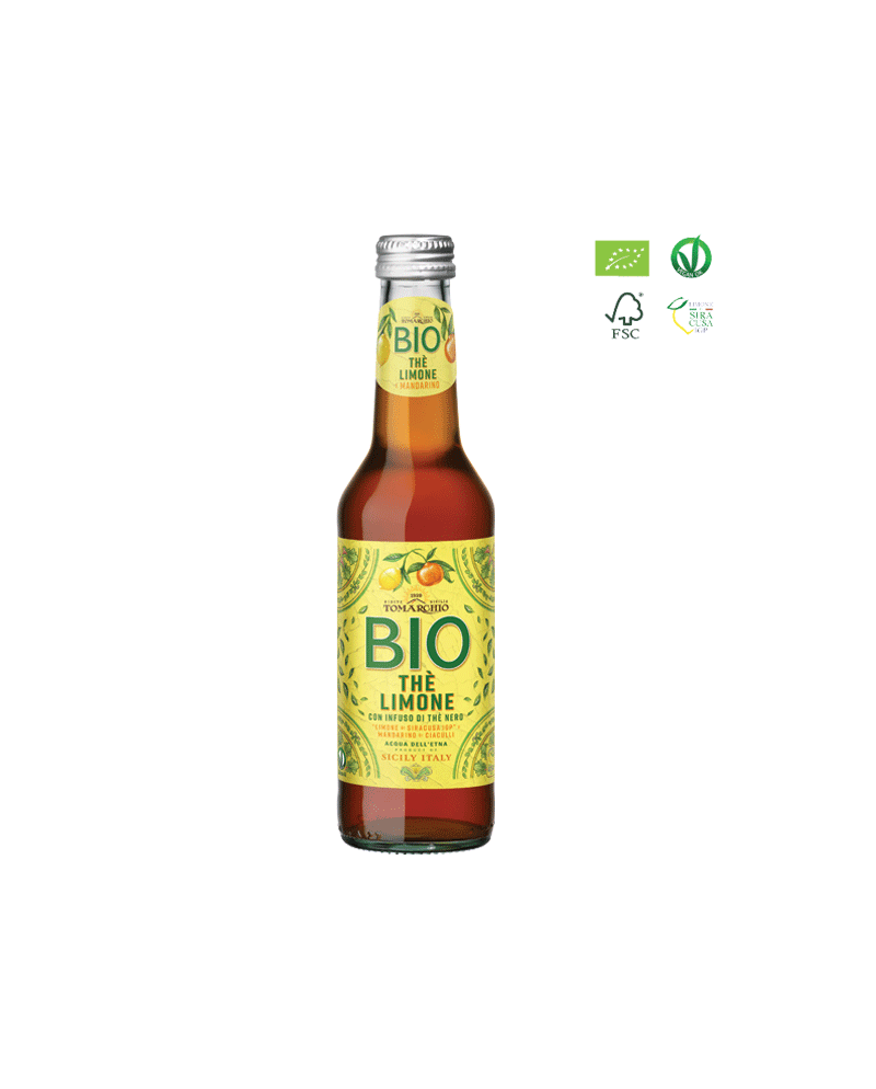 Te' limone e mandarino bio Tomarchio in bottiglia da 275ml. Infuso biologico con limoni siciliani di Siracusa IGP e mandarini di Ciaculli, aromatizzato naturalmente.