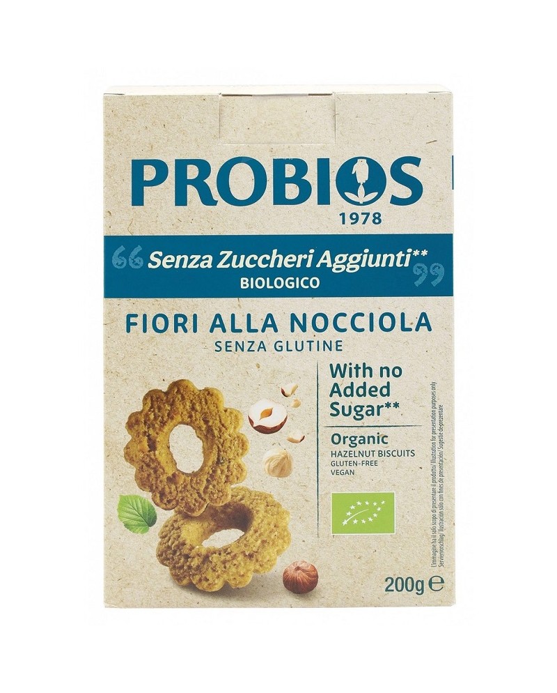 Fiori alla nocciola Probios in confezione da 200g. Sfiziosi biscotti biologici con farina di riso integrale ,all'aroma naturale di nocciola, con granella. Per chi cerca una colazione leggera senza rinunciare alla golosità.