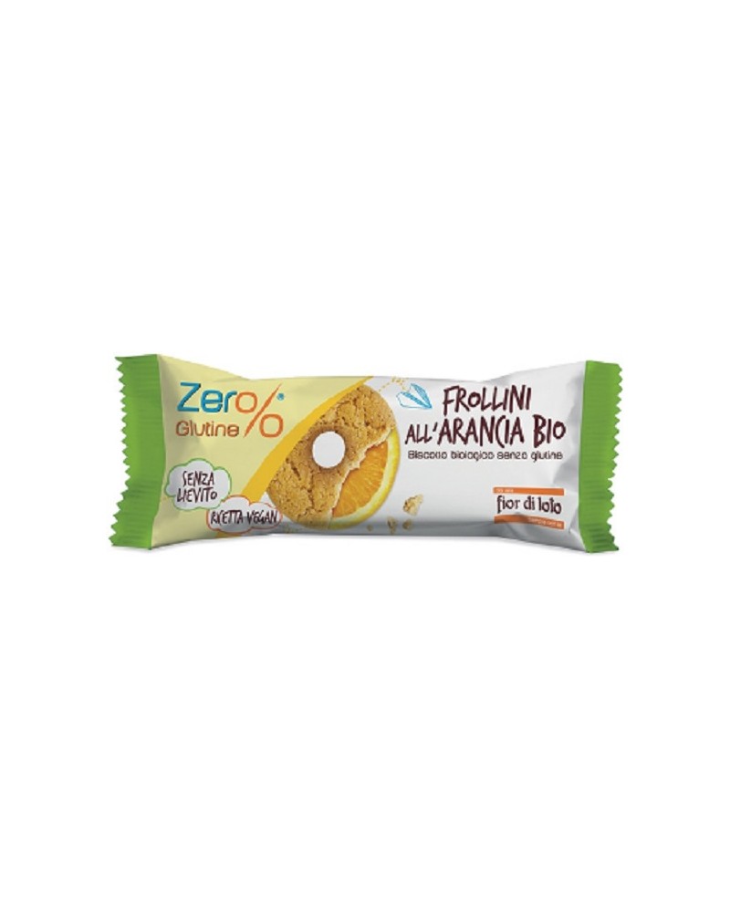 Frollini all'arancia bio Zer% in pacchetto monodose da 30g. Prodotti con farina di riso e mais, senza lievito ne uova, aromatizzati con estratto naturale di arancia. Leggeri ed irresistibili.