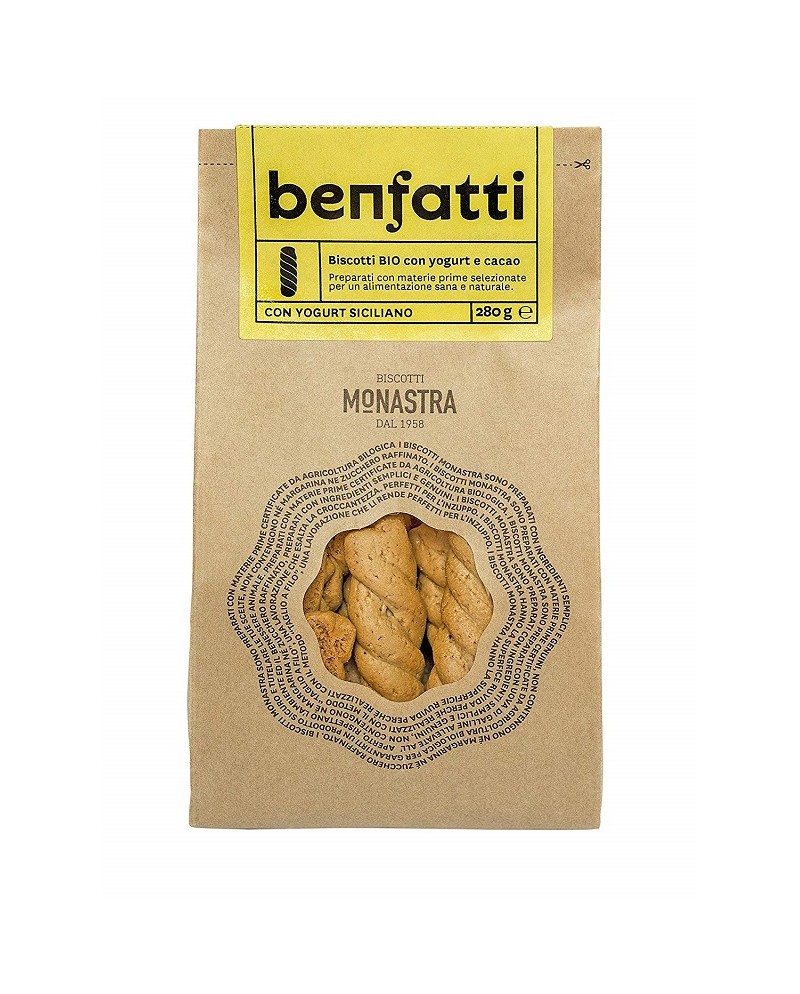 Biscotti con yogurt e cannella bio Monastra in confezione da 280g. Prodotti con materie prime accuratamente selezionate, sono ideali da inzuppare nel latte per una colazione energetica e sana.