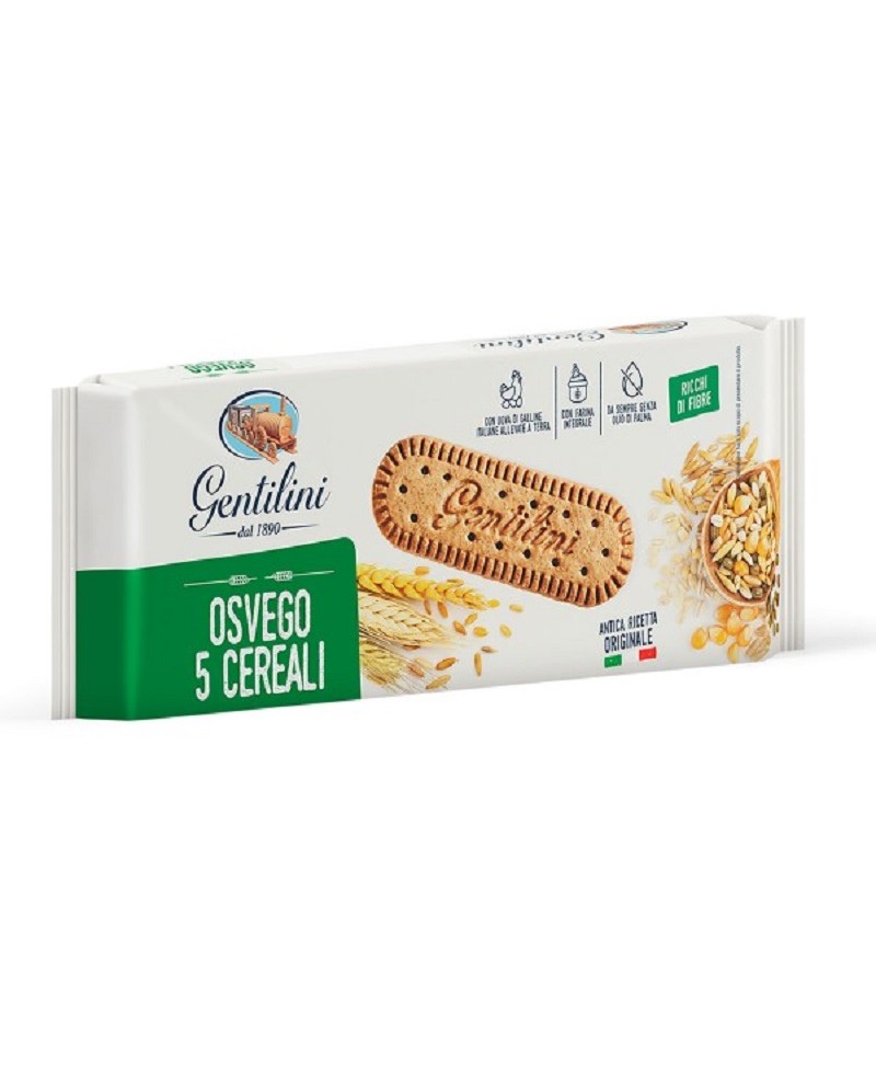 Gli Osvego 5 Cereali Gentilini sono biscotti frollini che arricchiscono la ricetta Osvego con farina integrale e una miscela di 5 cereali: Orzo, Segale, Mais, Avena e Soia. Sono anche ricchi di fibre e contengono uova fresche da galline allevate a terra.