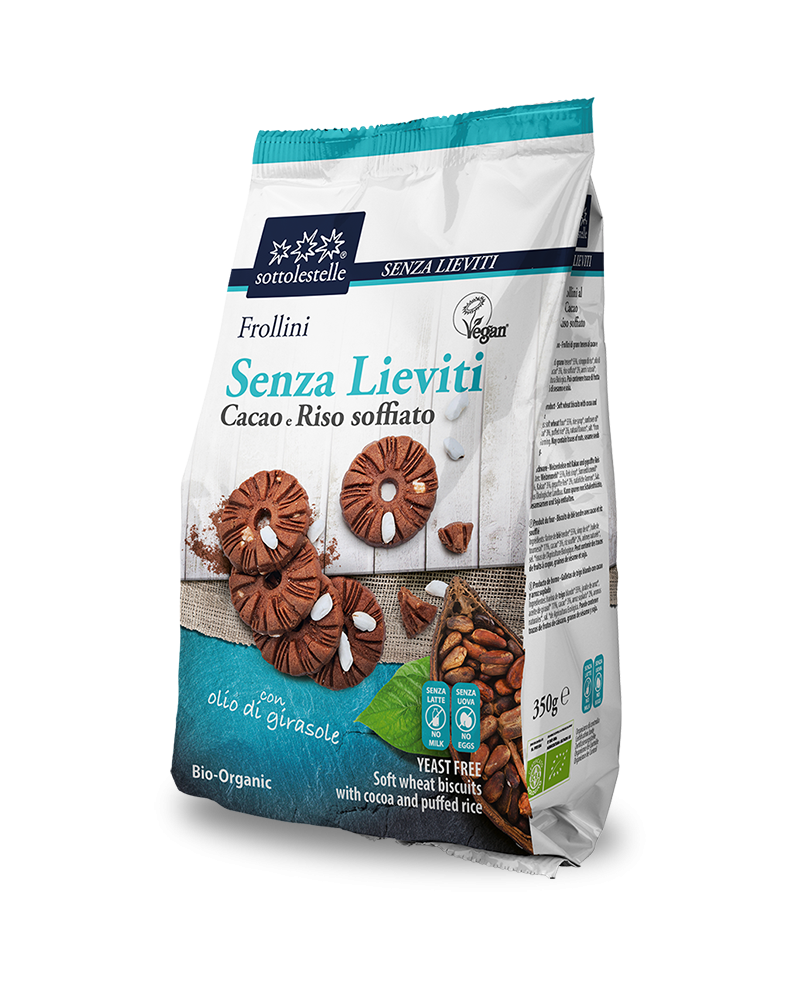 Frollini al cacao e riso soffiato "Sotto le stelle" in confezione da 350g. Frollini friabili e golosi caratterizzati dall'unione della farina di grano tenero con il gusto intenso del cacao e la croccantezza del riso soffiato. La ricetta è realizzata con olio di girasole alto oleico ed è senza latte, uova e lievito, rendendoli adatti a una dieta vegana. Sono perfetti per una colazione o una merenda ricca di gusto.