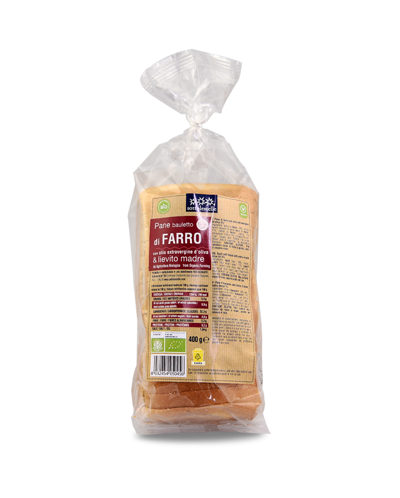Pane bauletto di farro sottolestelle in confezione da 400g. Pane a fette (bauletto) morbido e fragrante, interamente realizzato con farina di farro e lievitato naturalmente con pasta madre di farro. È un'ottima alternativa al pane di grano, apprezzato per il sapore rustico del farro e per l'alto contenuto di fibre. È senza zuccheri aggiunti, senza latte e senza uova (vegano).