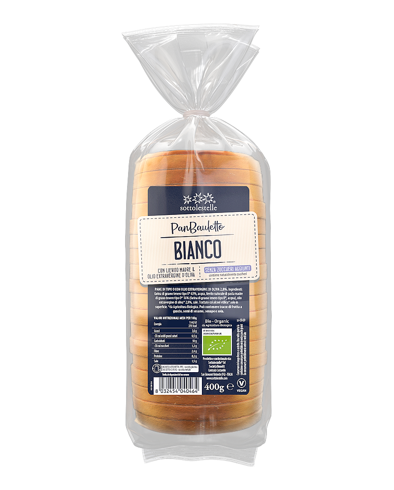 Pane bauletto bianco sottolestelle in confezione da 400g. Classico pane a fette (bauletto) morbido e fragrante, realizzato con farina di grano tenero tipo 0 e lievitato naturalmente con pasta madre. La ricetta, che include olio extra vergine d'oliva, garantisce un sapore delicato e una consistenza ideale per essere tostato o consumato fresco. È senza zuccheri aggiunti, senza latte e senza uova (vegano).