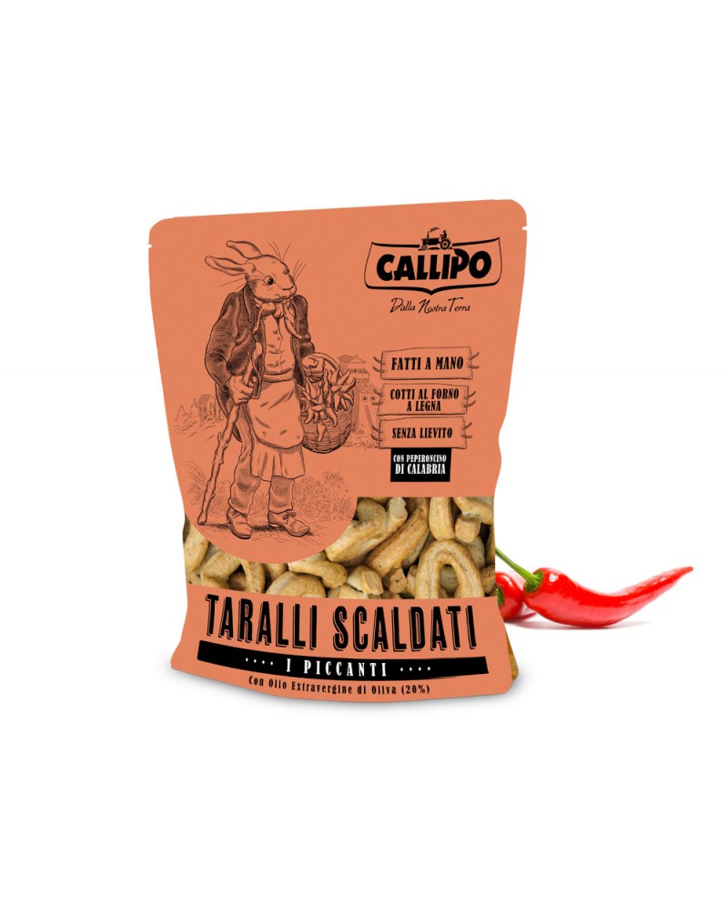 Taralli piccanti Callipo in confezione da 330g. Preparati con farina 00 di grano tenero e cotti al forno a legna, infine conditi con olio extra vergine d'oliva e peperoncino di Calabria. Da sgranocchiare al naturale per un aperitivo sfizioso.