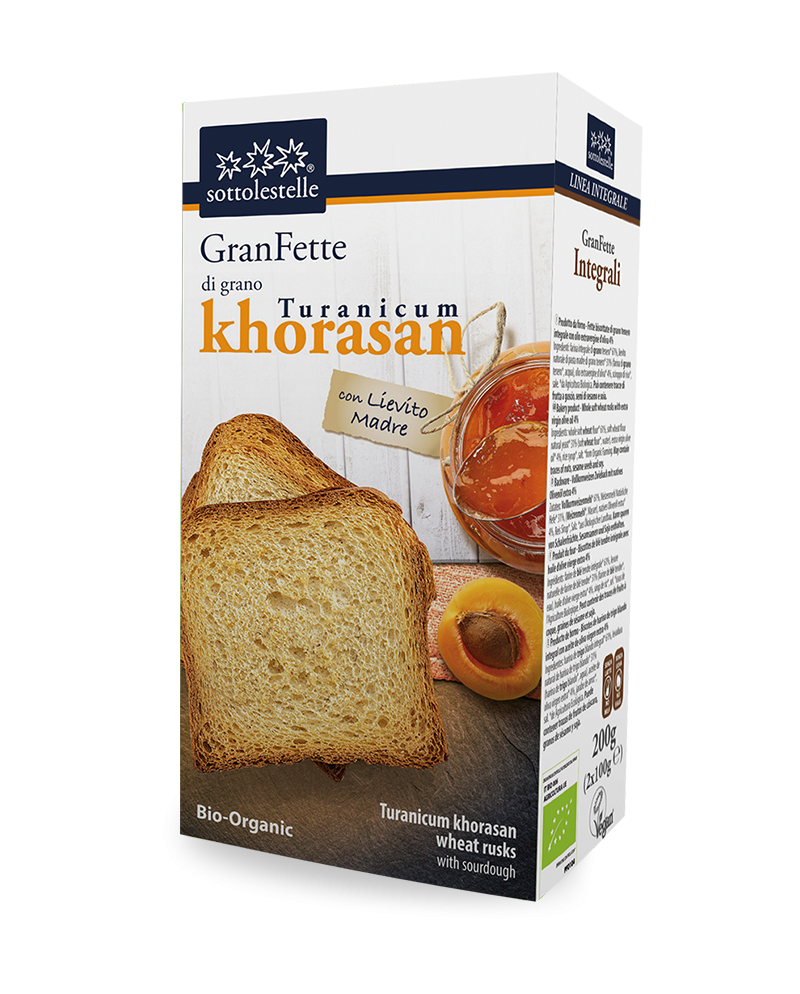 Fette biscottate leggere, dorate e friabili, realizzate con il prezioso Grano Khorasan KAMUT®, un cereale antico molto digeribile. Sono condite con olio extra vergine d'oliva e prodotte con una lunga lievitazione a base di pasta madre, che le rende particolarmente leggere. Sono senza saccarosio, uova e adatte a una dieta vegana.
