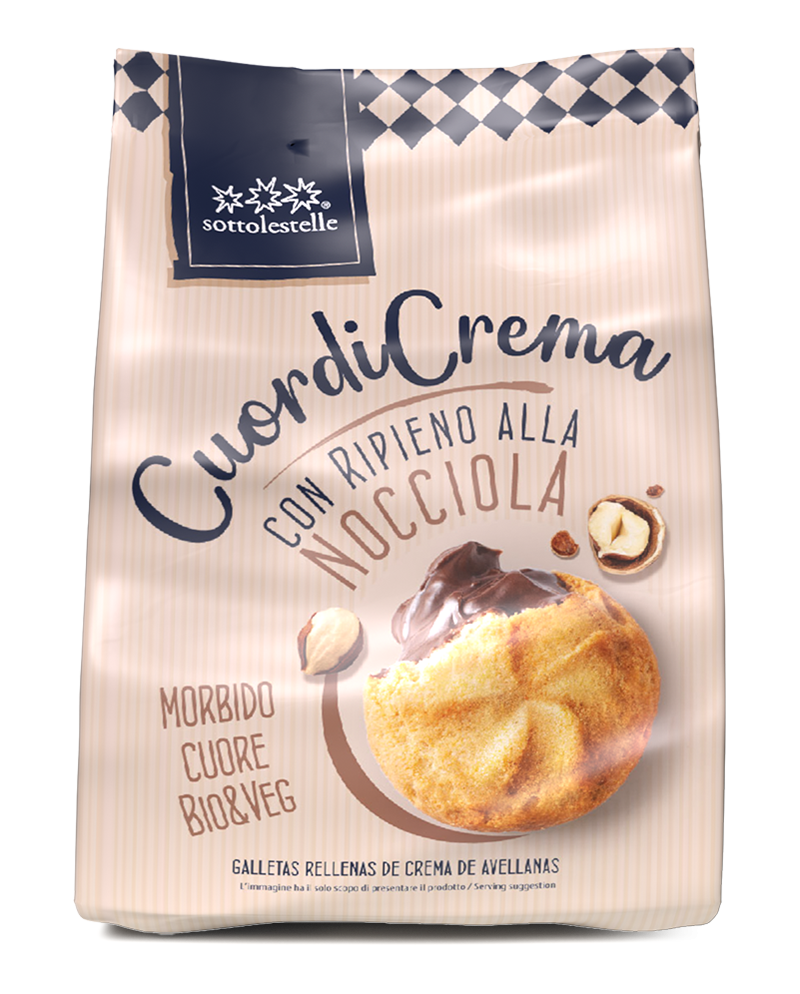 Frollini friabili con un morbido ripieno di crema alla nocciola. Sono realizzati con farina di grano tenero, margarina vegetale e dolcificati principalmente con zucchero di canna. Sono prodotti nel bio-forno Sottolestelle e sono senza olio di palma, ideali per chi cerca una pausa golosa e biologica.