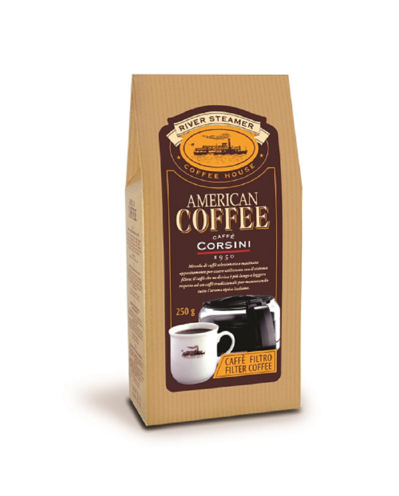 American coffee 250g Corsini. Miscela di caffè selezionata e macinata appositamente per essere utilizzata con il sistema filtro: il caffè che ne deriva è più lungo e leggero rispetto ad un caffè tradizionale pur mantenendo tutto l’aroma tipico italiano. Si consiglia l’utilizzo del filtro in carta per ottenere un caffè di migliore qualità.