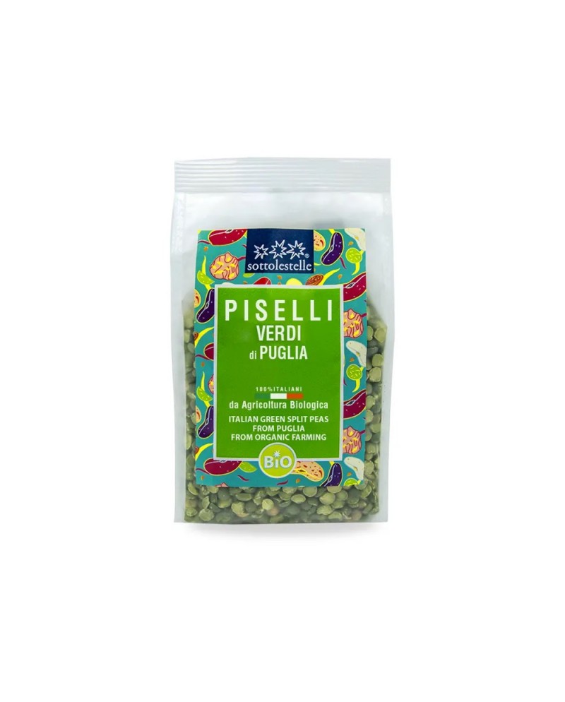 Piselli verdi di Puglia decorticati Sotto le stelle in confezione da 400g. Legumi secchi coltivati in Puglia con metodo biologico. I piselli vengono decorticati (privati della buccia) e spezzati, un processo che li rende particolarmente adatti per la preparazione di creme, vellutate e zuppe, poiché risultano più teneri e richiedono tempi di cottura ridotti (non è necessario l'ammollo). Sono un'ottima fonte di proteine vegetali.