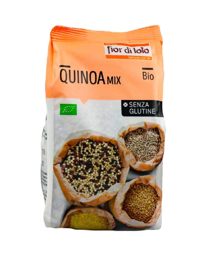 Quinoa mix bio Fior di loto in confezione da 400g. Miscela di quinoa nera, bianca e rossa 100% biologica e senza glutine. Ideale come base per piatti principali gustosi e salutari o come contorno o nelle insalate.