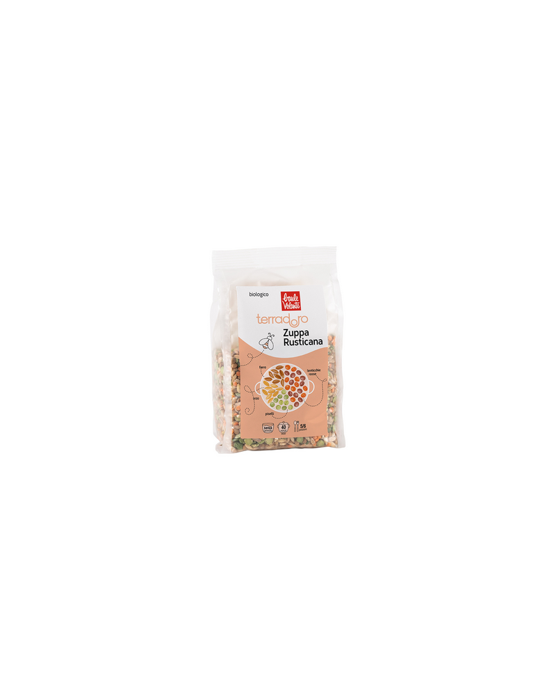 Ingredienti: Farro perlato* 20%, lenticchie rosse decorticate* 20%, lenticchie* 20%, orzo decorticato* 20%, piselli decorticati spezzati* 20%. (*da agricoltura biologica)