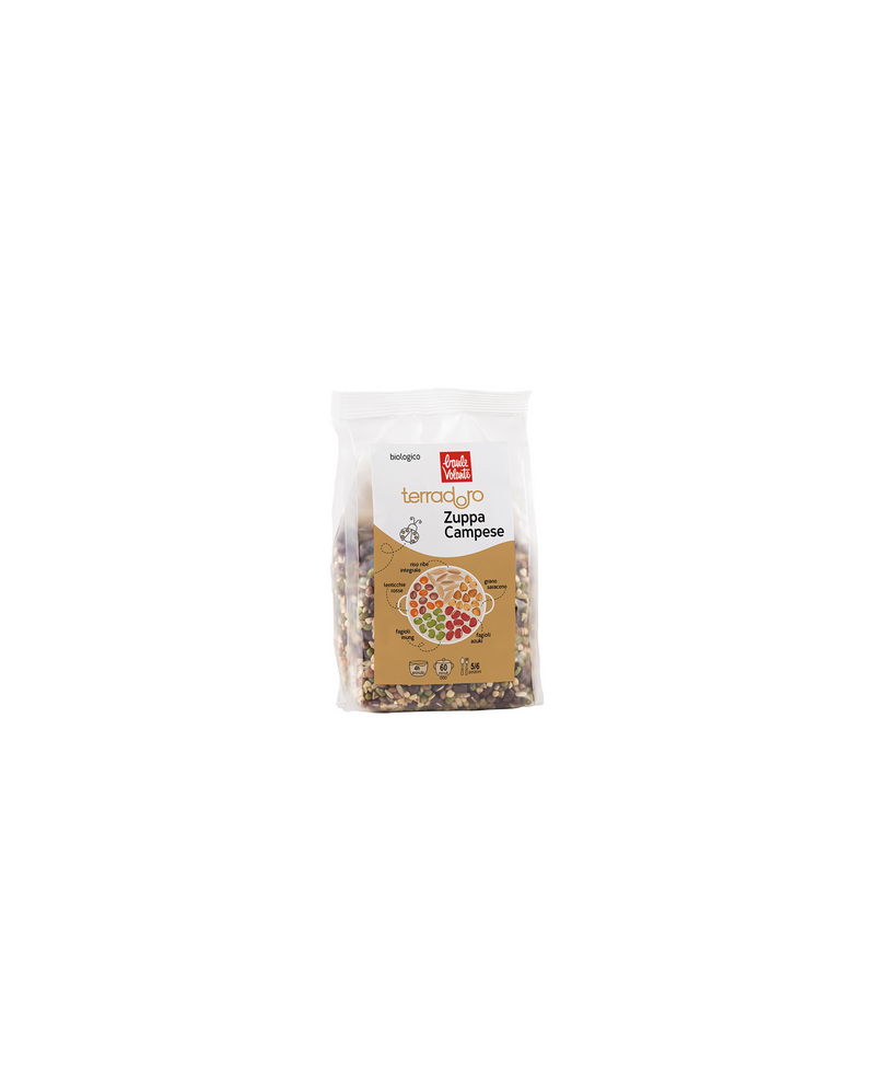 Zuppa campese saraceno azuki Terradoro Baule Volante in confezione da 400g. Combinazione nutriente di grano saraceno e fagioli azuki, ricca di proteine, fibre e sapore.
