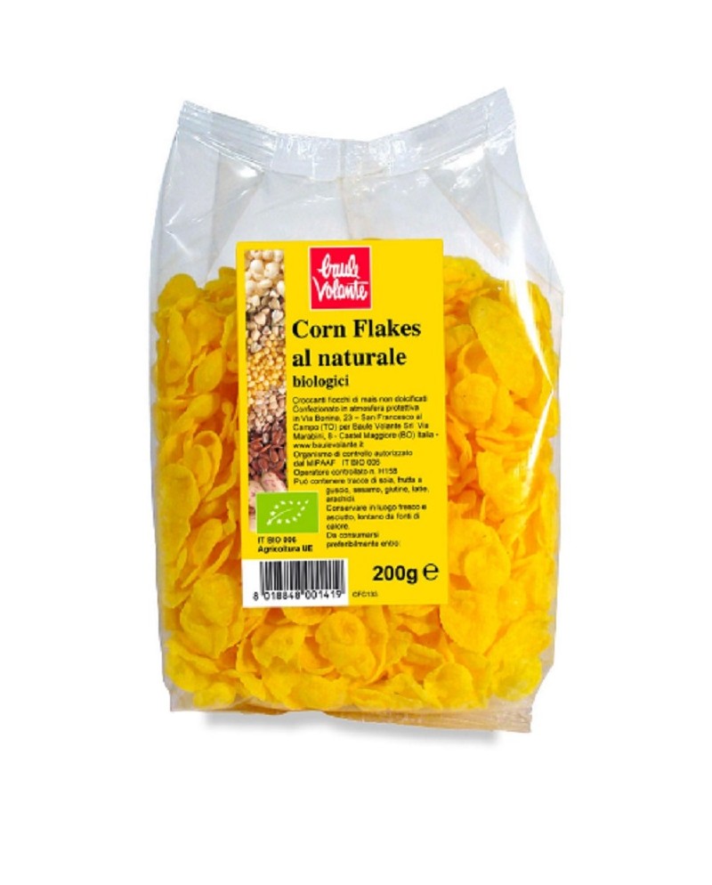 Corn flakes naturali "Baule Volate" in confezione da 200g. Fiocchi di mais croccante di alta qualità senza zuccheri o aromi artificiali, ideali per una colazione gustosa ed equilibrata.