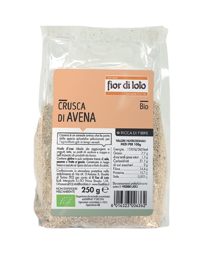 Crusca di avena "Fior di loto" in confezione da 250g. Alleato numero uno per il corretto mantenimento del tratto intestinale, la crusca d'avena è naturalmente ricca di vitamine, fibre, zinco e magnesio. Può essere impiegata nella preparazione di prodotti da forno o può essere aggiunta a cereali, latte o yogurt.