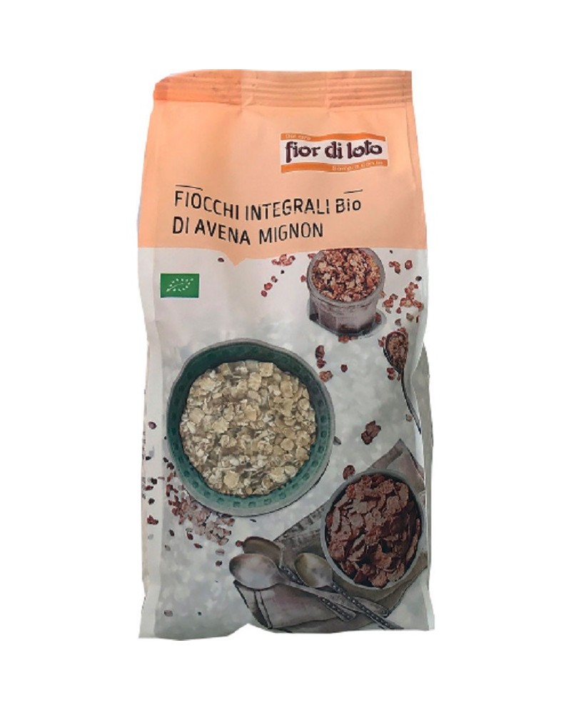 Fiocchi di avena mignon "Fior di loto" in confezione da 500g. Avena integrale biologica tagliata in fiocchi finissimi, ideale a colazione o come piatto d'accompagnamento durante i pasti principali. Dall'alto contenuto di fibre e proteine.