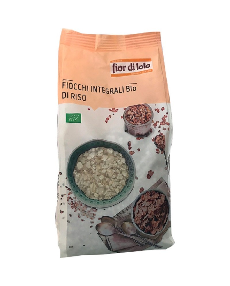 Fiocchi di riso integrale "Fior di loto" in confezione da 500g. Croccanti e dal sapore delicato, possono essere impiegati in zuppe, insalate o aggiunti a latte e yogurt.