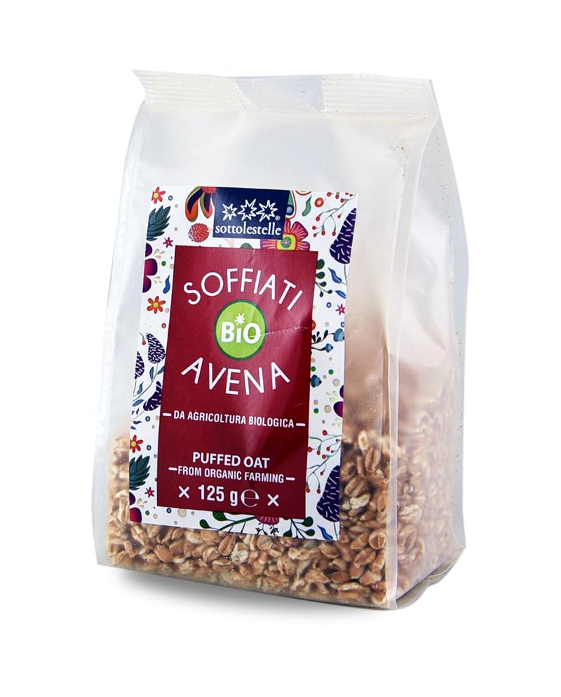 Avena soffiata Sotto le stelle in confezione da 125g. Ottenuta dalla cottura a vapore dell'avena in chicchi e successiva espansione. Questo processo conserva le proprietà nutrizionali originali del cereale, fornendo un buon apporto di fibre e proteine. Perfetta per una colazione leggera, si abbina a latte, yogurt o bevande vegetali.
