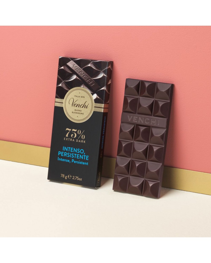 Caratterizzato da una percentuale del 75% di cacao di alta qualità, offre un equilibrio perfetto tra l'amarezza del cacao e la dolcezza naturale creando un sapore profondo ad ogni morso.