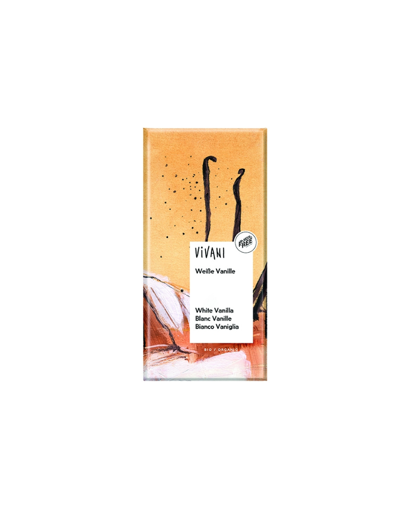 Cioccolato bianco vaniglia Vivani in confezione da 80g. Cioccolato bianco purissimo con bacche di vaniglia Bourbon. Dolcificato con zucchero di canna naturale, non contiene lecitina di soia o altri emulsionanti.
