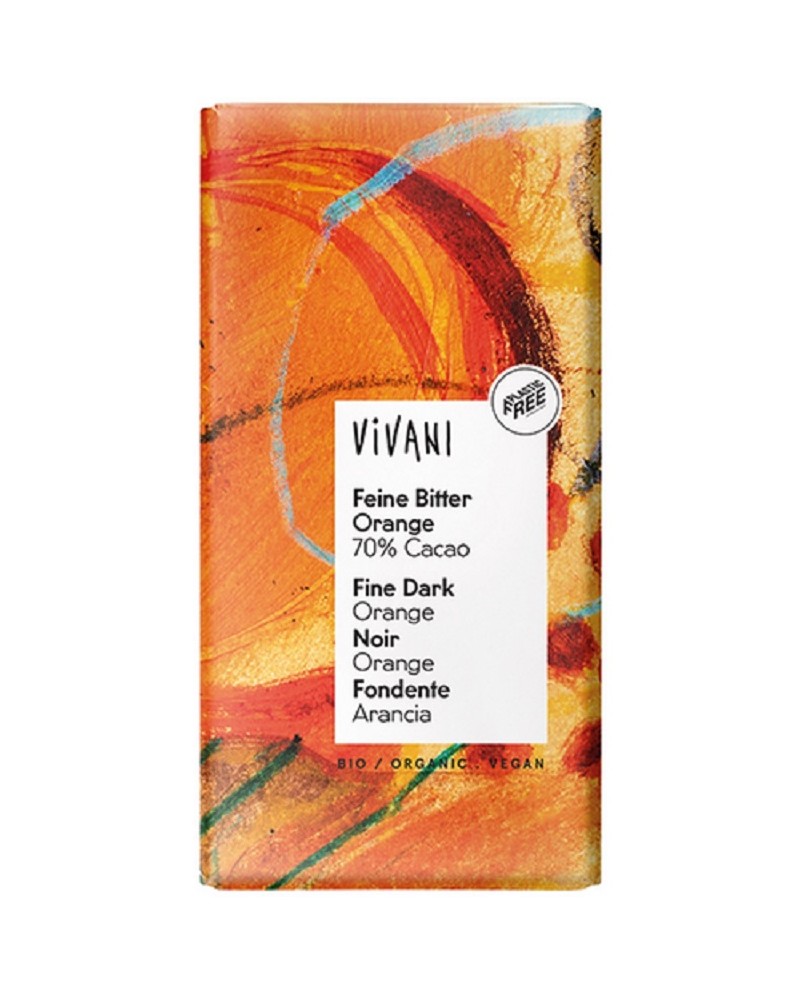 Cioccolato fondente all'arancia Vivani in confezione da 100g. Finissimo fondente ad alto contenuto di cacao, profumato con olio di arancia.