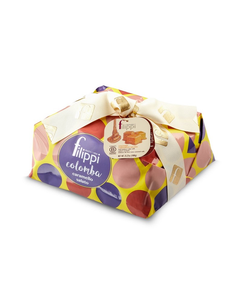 Colomba Filippi con caramello salato, in confezione da 1kg. Una colomba al caramello salato per chi apprezza i sapori intensi, gli abbinamenti arditi... un lievitato straordinario, un impasto leggero guarnito da cremosi pezzetti di caramello in cui il senso di dolcezza iniziale è mitigato e reso più intrigante da una lievissima ma immediata sapidità.