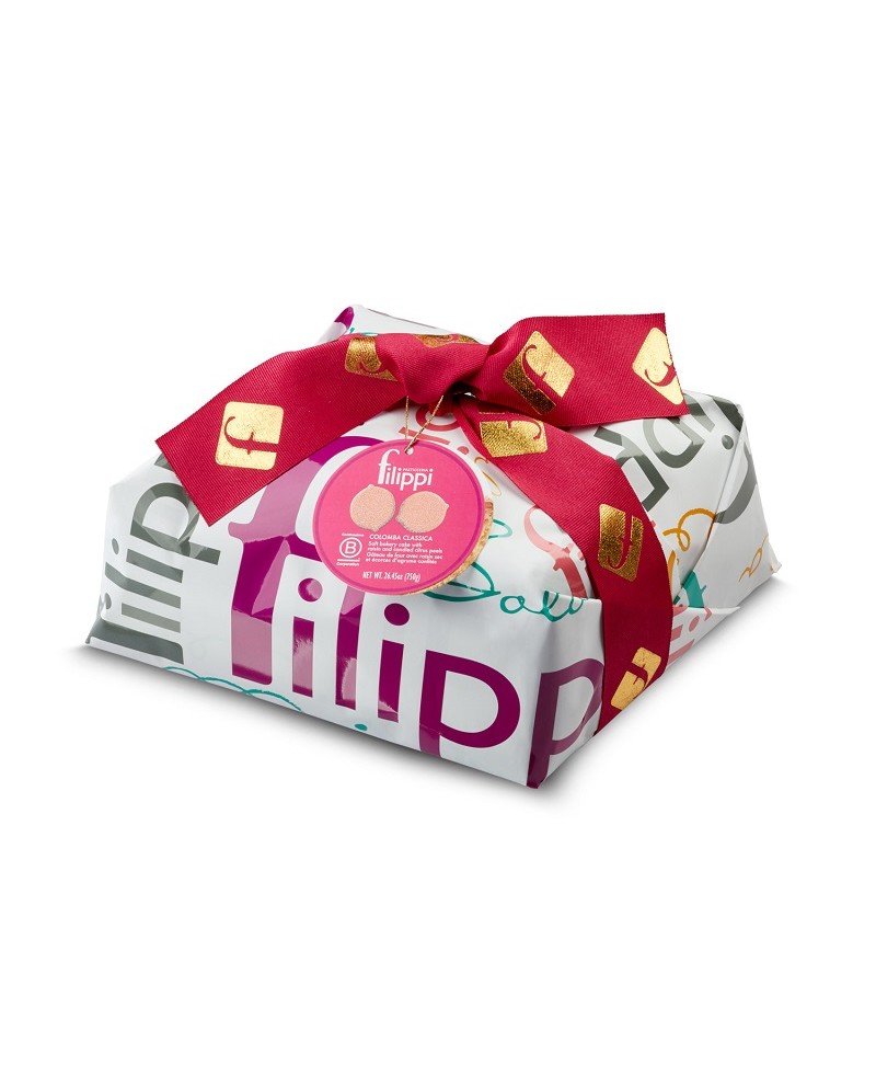 La classica Filippi è la colomba per antonomasia, sintesi autentica di tradizione e genuinità degli ingredienti. Burro, farina, uova e bacche di vaniglia sono sapientemente miscelati a formare una trama glutinica irregolare tipica della lievitazione naturale. Cubetti di scorzone d'arancia candita arricchiscono e profumano un impasto soffice e dal gusto delicato. La glassatura è ricca e croccante, ottenuta miscelando pregiate mandorle “Prima Bari”, zucchero ed albume. Grande cura anche per l'incarto per rendere bello ciò che è buono. Ogni colomba è confezionata a mano: incarto plastificato opaco e nastro in gros grain con serigrafie gommate in rilievo.